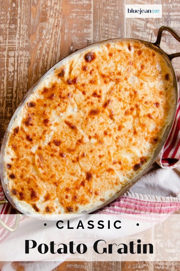 The right pan for the job is one that is not too deep. You want the heat to surround the potato gratin properly, giving the top surface full exposure to the heat. A pan that is too deep will insulate the top of the gratin and prevent it from browning properly. The classic potato gratin dish is an oval pan like this one. It makes a spectacular presentation at the table too, which is important since you can’t transfer the whole gratin to a serving dish. If you don’t have a classic gratin dish, any shallow-sided pan will do the trick and you can portion out the potatoes onto plates before taking the plates to the table.