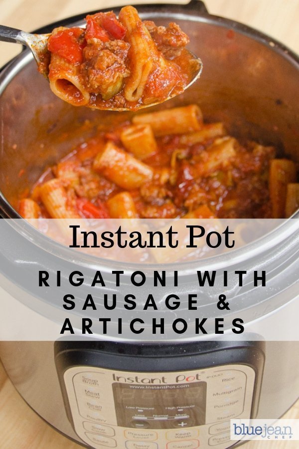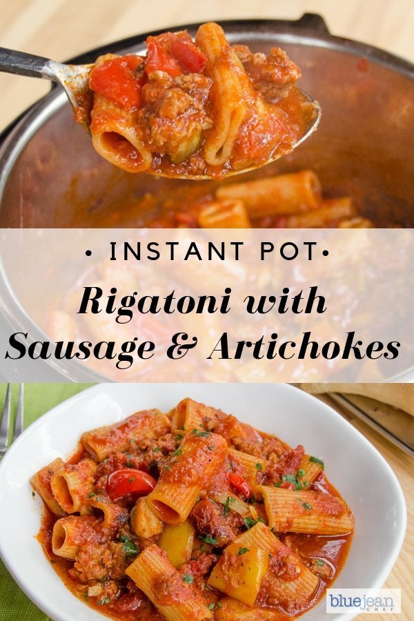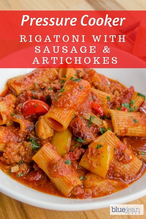 The beauty of this recipe is that you can make it in a pressure cooker OR on the stovetop. Making rigatoni with Italian sausage in a pressure cooker allows you to cook the dried noodles right in the sauce, saving time and cleaning up a second pot. The whole thing is done in a quick 7 minutes of cooking time. Yes, you do need to wait for the pressure cooker to build pressure, but it’s a quick-release of pressure at the end and you’ll find the whole process gives you just enough time to tidy up the kitchen and lay the table. No need to call folks to the table – with the way this smells, they’ll be seated and waiting! For more benefits on cooking pasta in a pressure cooker, check out my cooking school article on How to Cook Pasta in a Pressure Cooker.