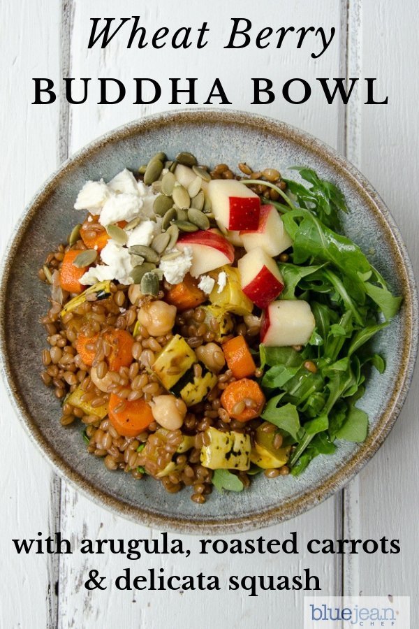 Once you have the wheat berries cooked, you can store them in your refrigerator and make a grain bowl with any number of ingredients later in the week. The recipe below is for making a wheat berry grain bowl from scratch, adding carrots and delicata squash, but these easy, delicious and good for you bowls really are perfect for using up leftovers. For instance, incorporate some leftover vegetables from dinner, a little leftover chicken or steak that isn’t enough to make a full meal, some scraps of cheese, a little fruit, any nuts or seeds you have around – all of these are good ingredients to top the wheat berries and make a delicious meal.